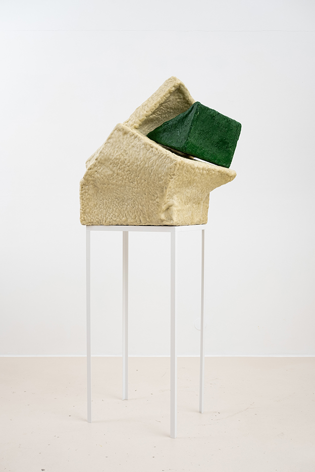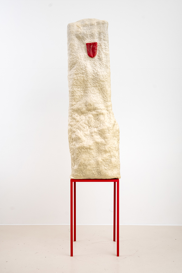 Her latest show operates within the sphere of emotions – transferring ultra-sensual and downright erotic notions and experiences into complex abstract forms. The four rooms of the gallery are occupied by a mystifying construction of reality, made up of forms/bodies absorbed in the act of love, engaged in various stages of intimacy and desire – or utterly overcome with passion. She uses simple forms, yet her works are in no way literal. The fleshy character of her approach is manifested through objects that are merely suggestive of corporality, cast in wax that is warm, soft like human skin. These massive installations in wax contain elements that are recognizable as humanlike, such as a relatively simple form that can instantly be interpreted as a neck, a tongue and the act of kissing.